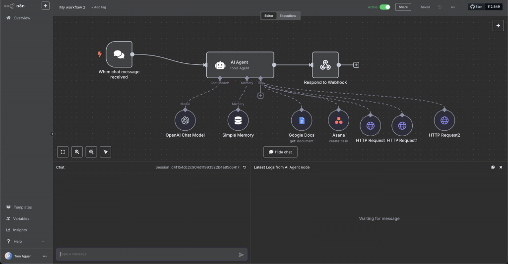 Ce projet réalisé en 3 jours consiste en la création d’un agent conversationnel intelligent intégré à un site web, le tout reposant sur la plateforme d’automatisation open source n8n et l’API d’OpenAI. L’objectif est d’automatiser des tâches internes afin de gagner du temps, telles que la récupération d’informations client ou commande, la création de tickets, ou la lecture de documents. L’agent est capable d’interpréter les requêtes utilisateur, de les traiter via une série de noeuds logiques, et d’y répondre de manière pertinente et personnalisée.